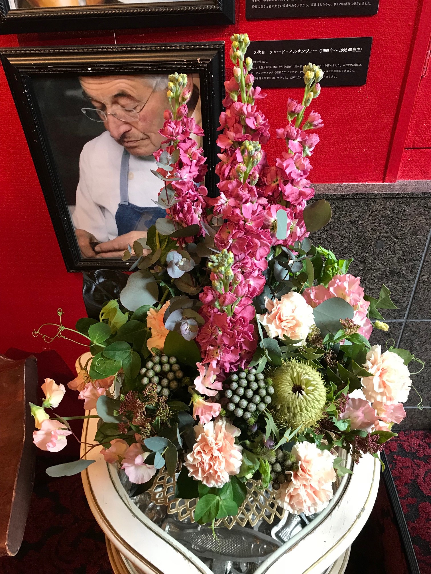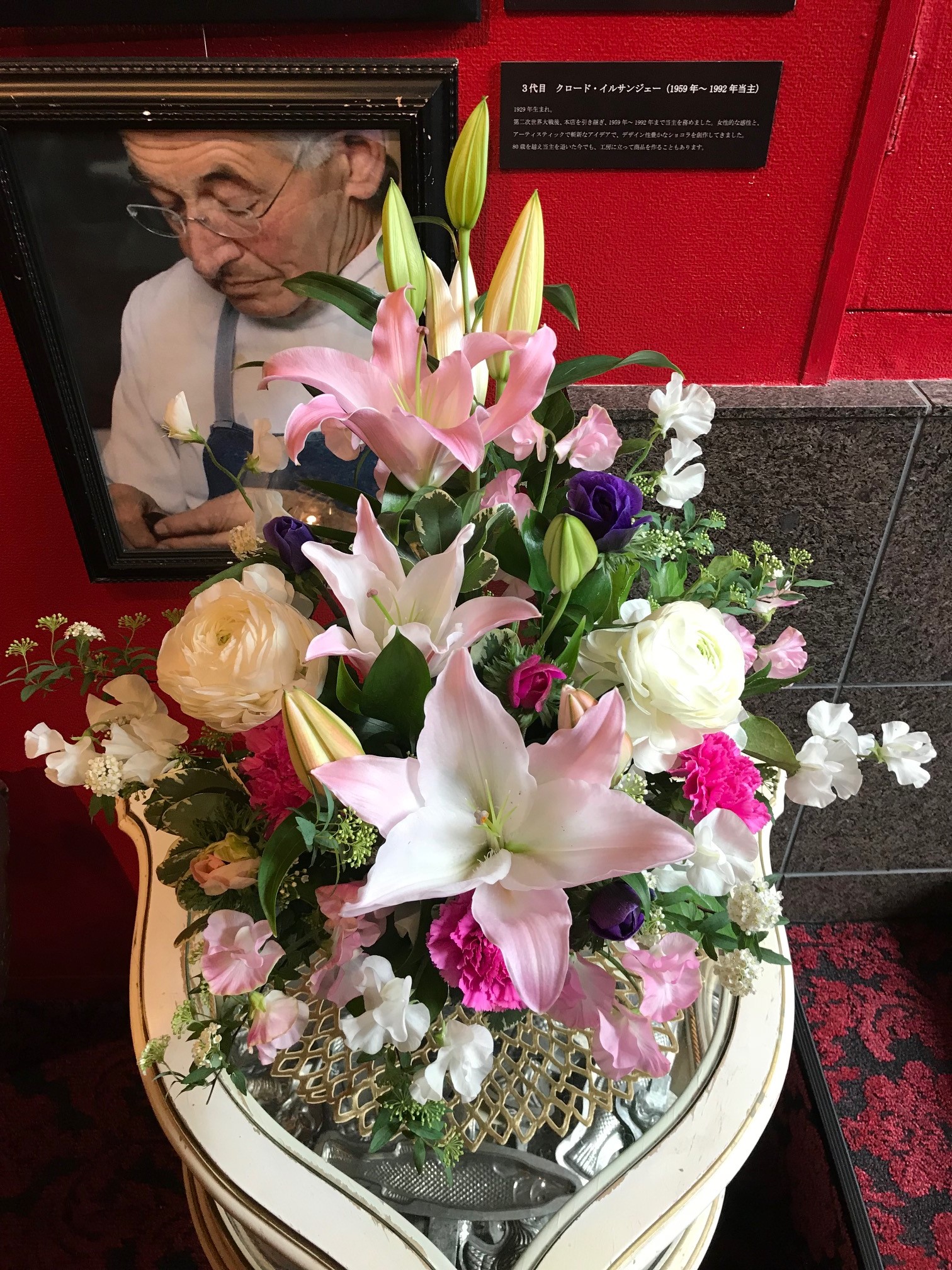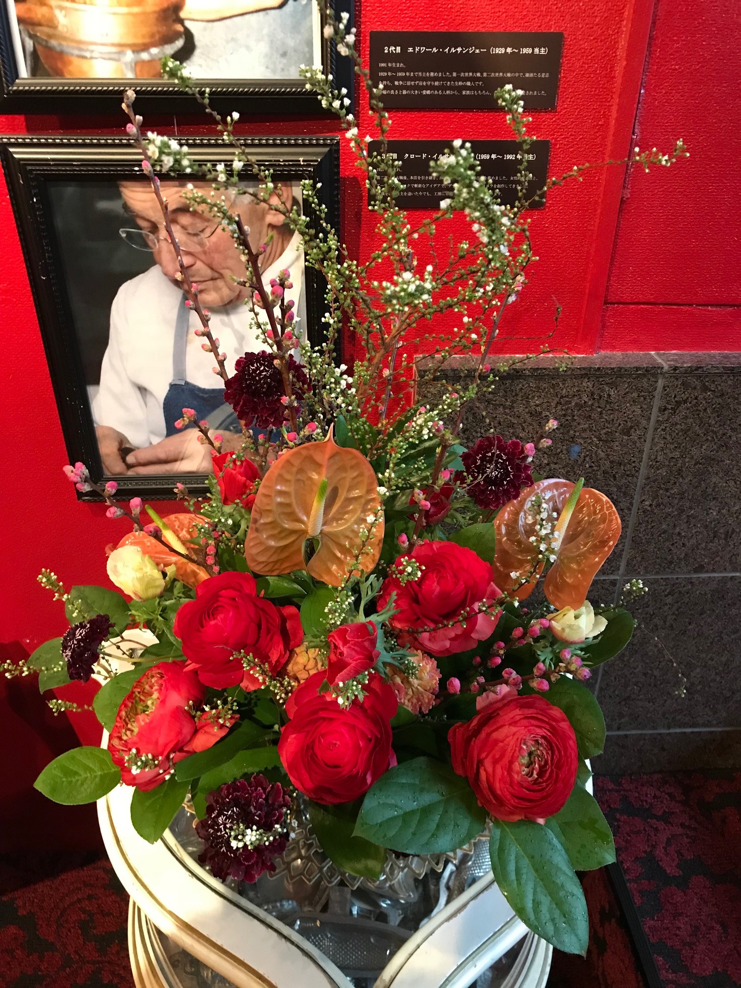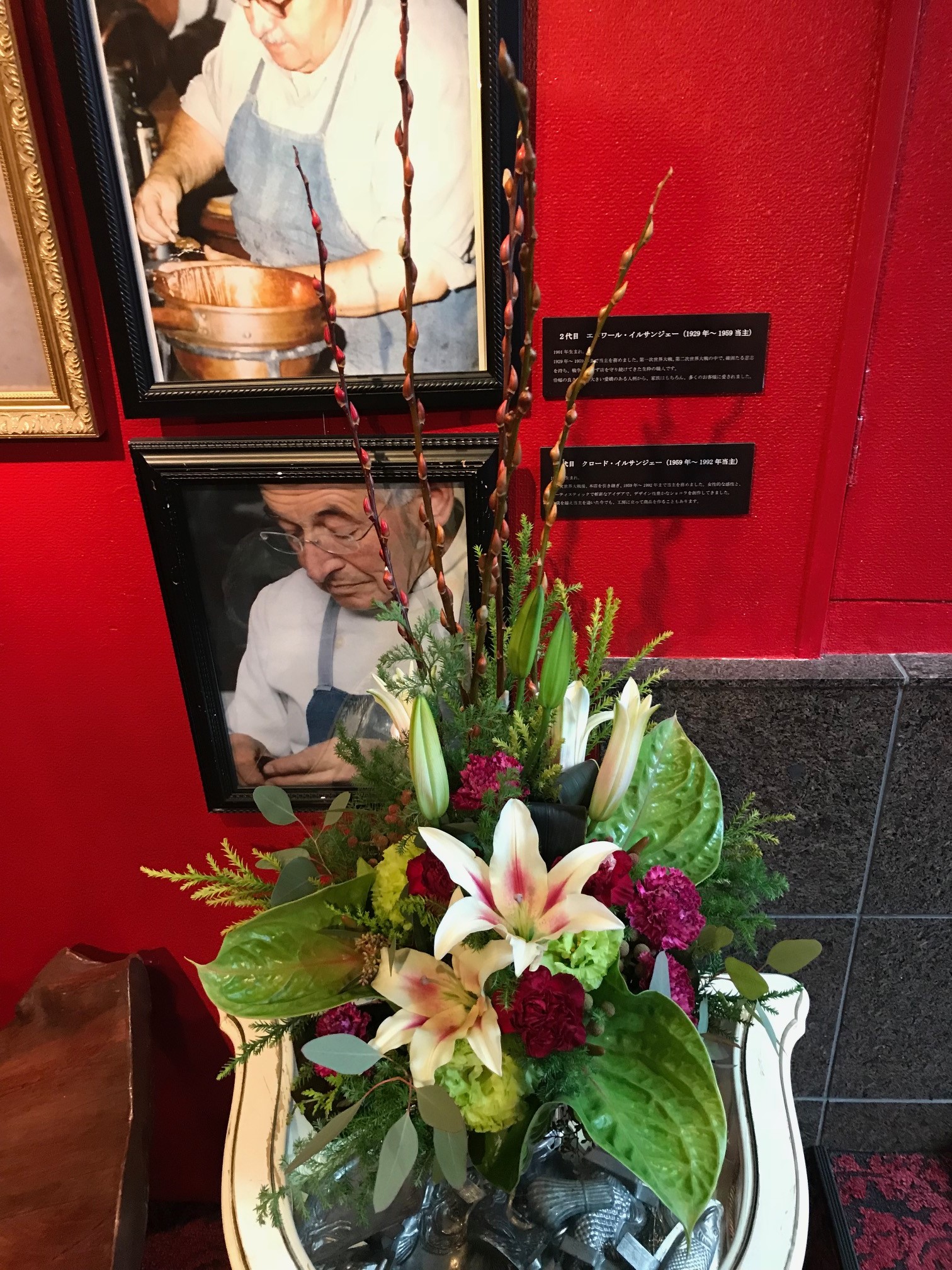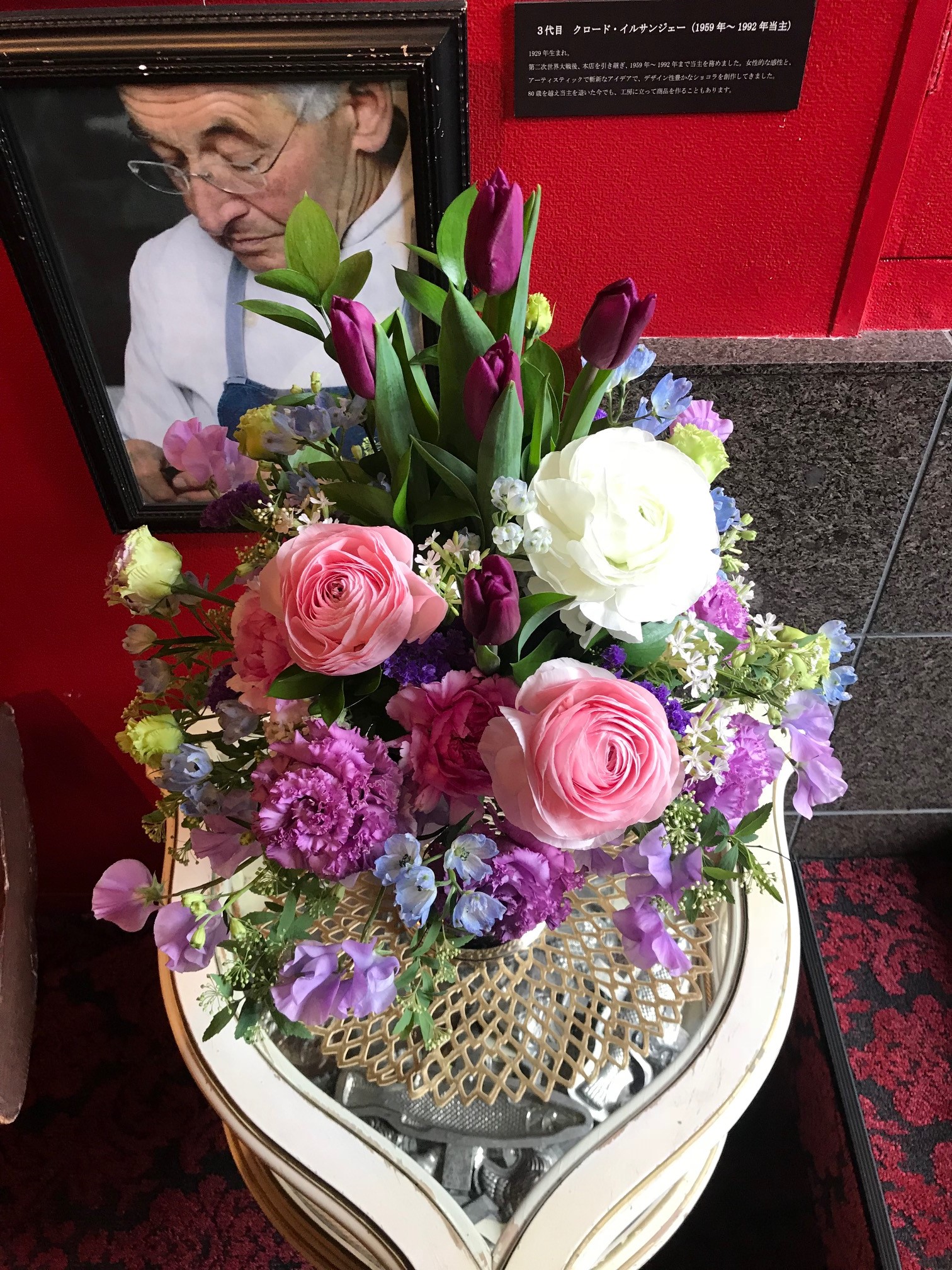 こちらは、117年一族が守り続けているフランスの名門ショコラティエ「イルサンジェー」様の季節のお花の活け込み例です。一週間毎にお花を活け替えさせていただいております。